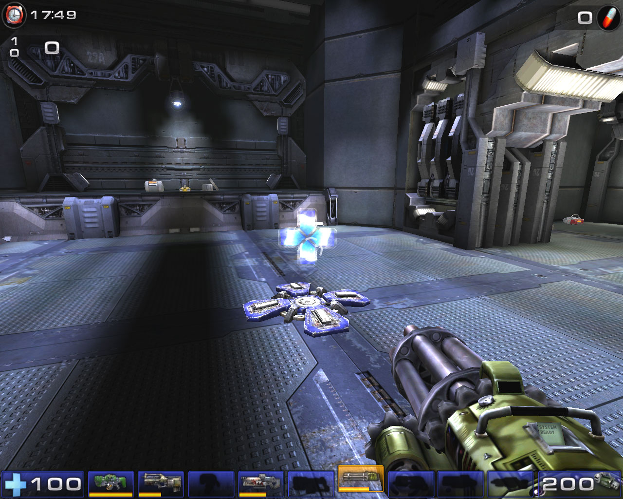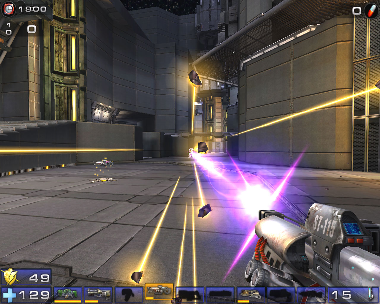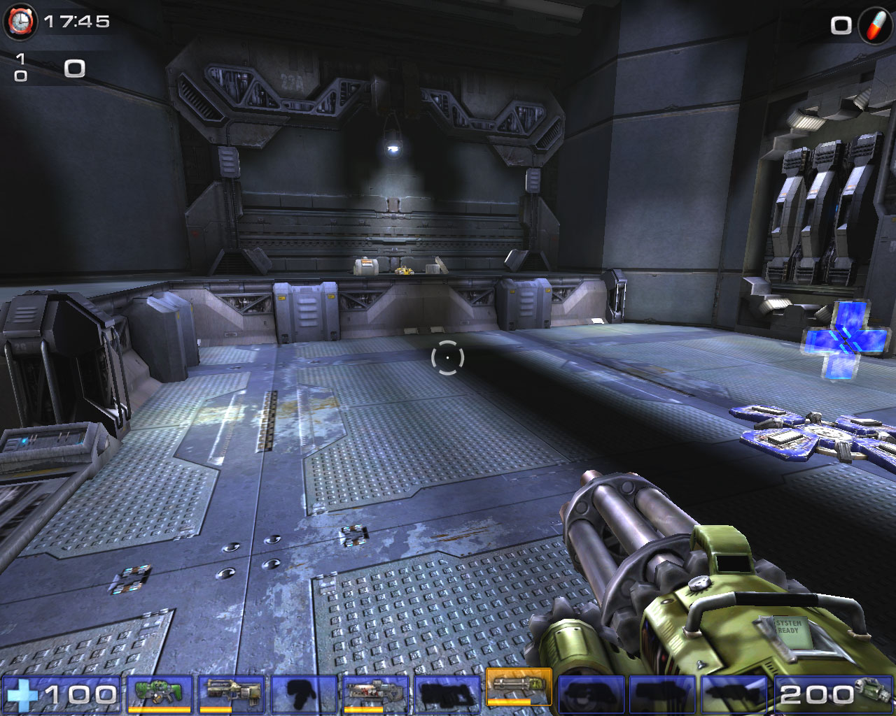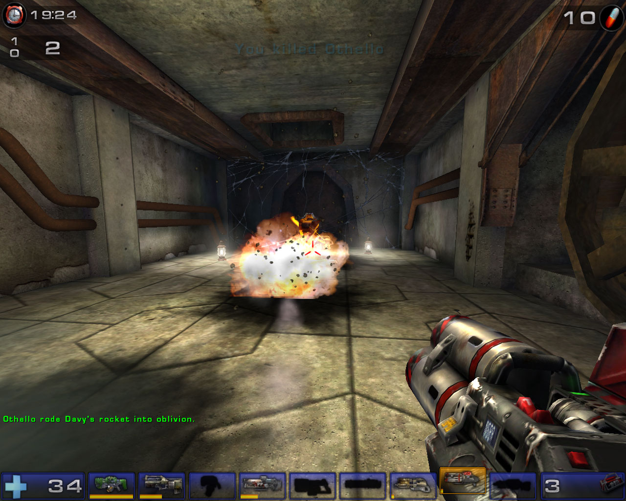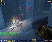 より正確な照準を身につけたい場合は,Shock Rifle[画面9]かLightning Gun[画面10]のみに限定して練習するといい。この二つの武器は連射が利かず,また着弾地点も狭く(ほぼ点)なので一発必中を期する必要があり,より正確な照準が求められるからだ。連射が利く武器(Assault RifleやMini Gun,Link Gun)や,破片が散ったり爆風が発生する武器(Flack Canon,Rocket Launcher)は着弾地点が広いため,多少照準が甘くてもなんとかなったりする[画面11,12]。 Shock RifleやLightning Gunで正確に命中するようになったら,かなり上達しているはずだ。