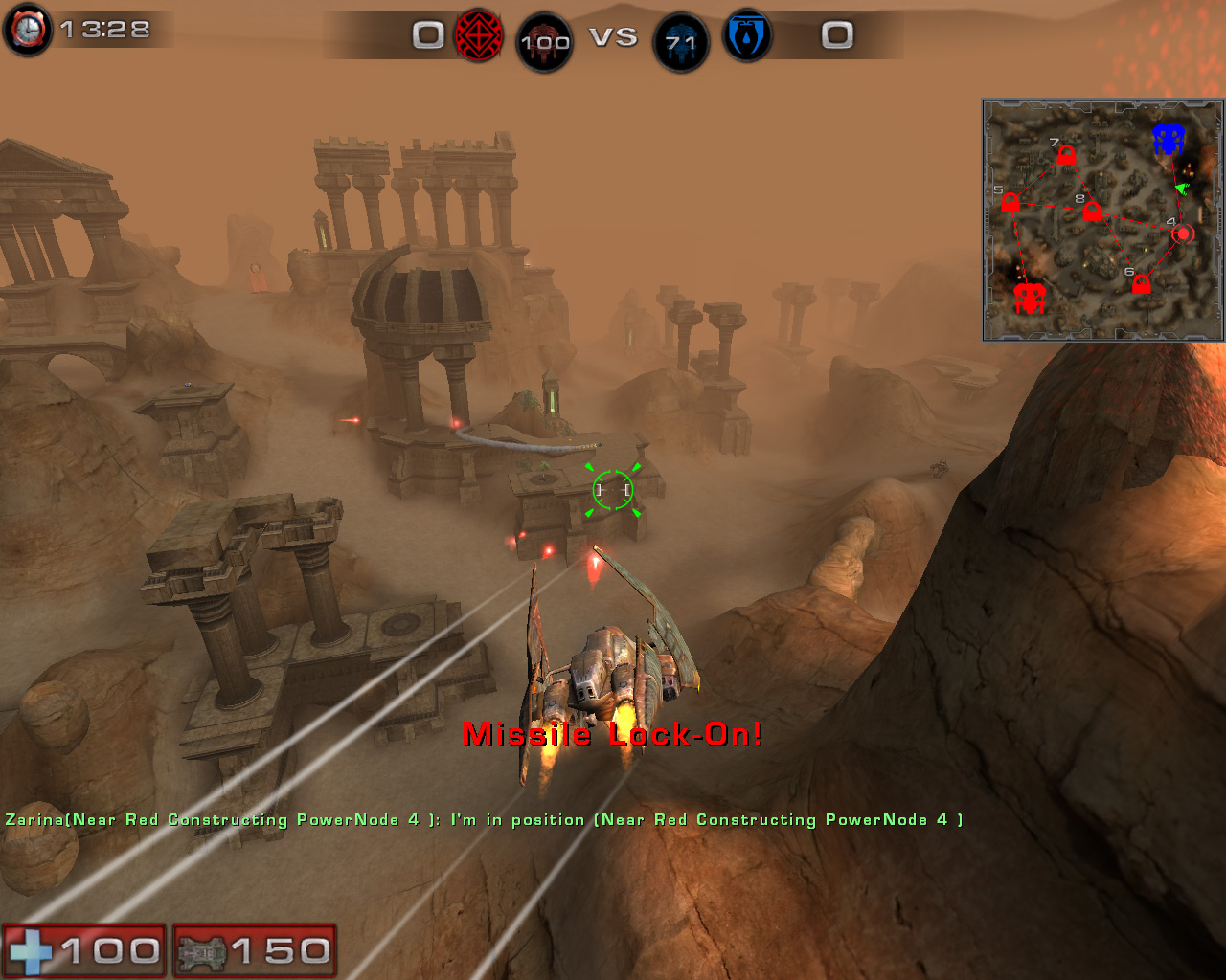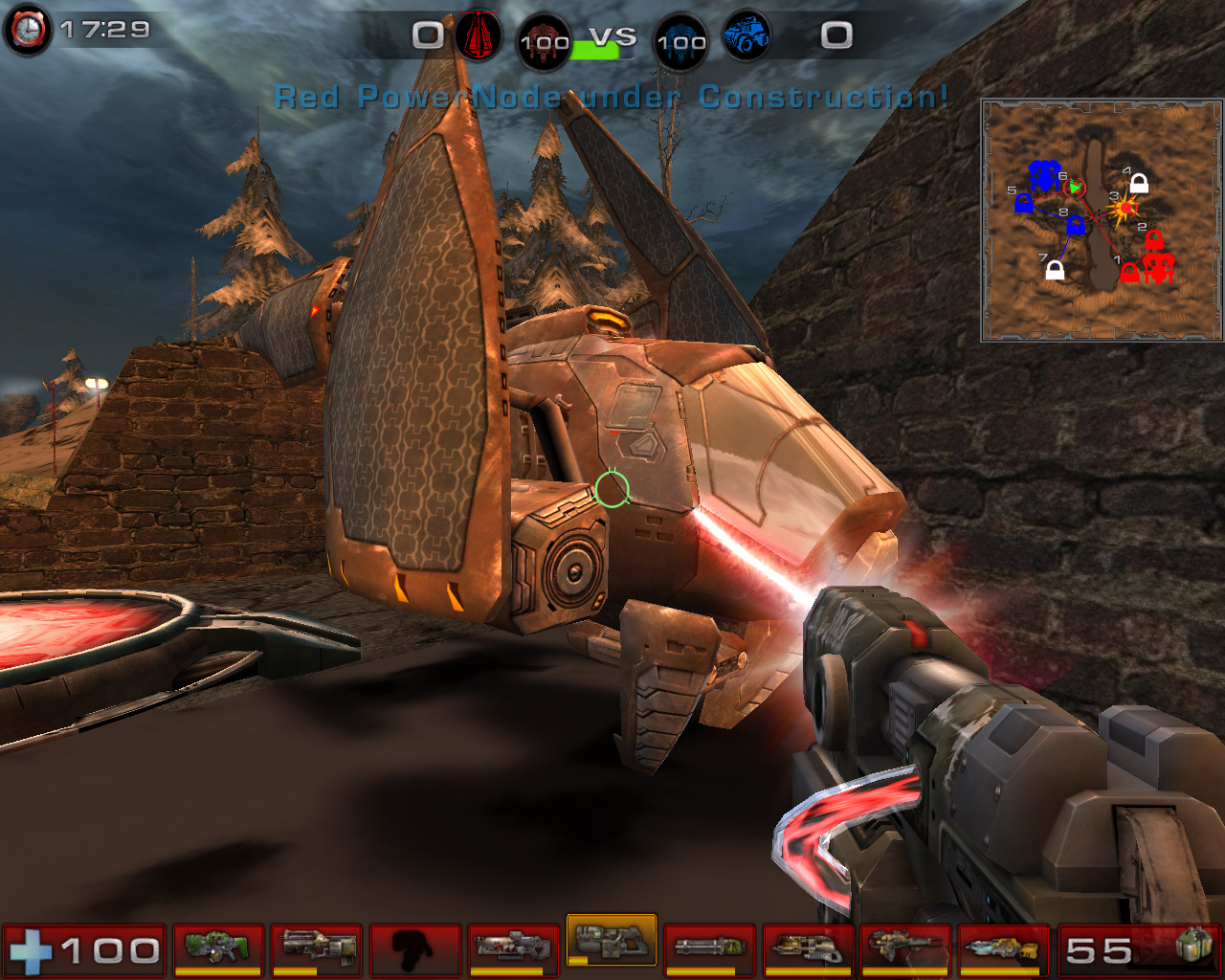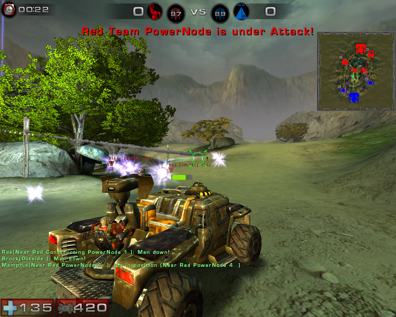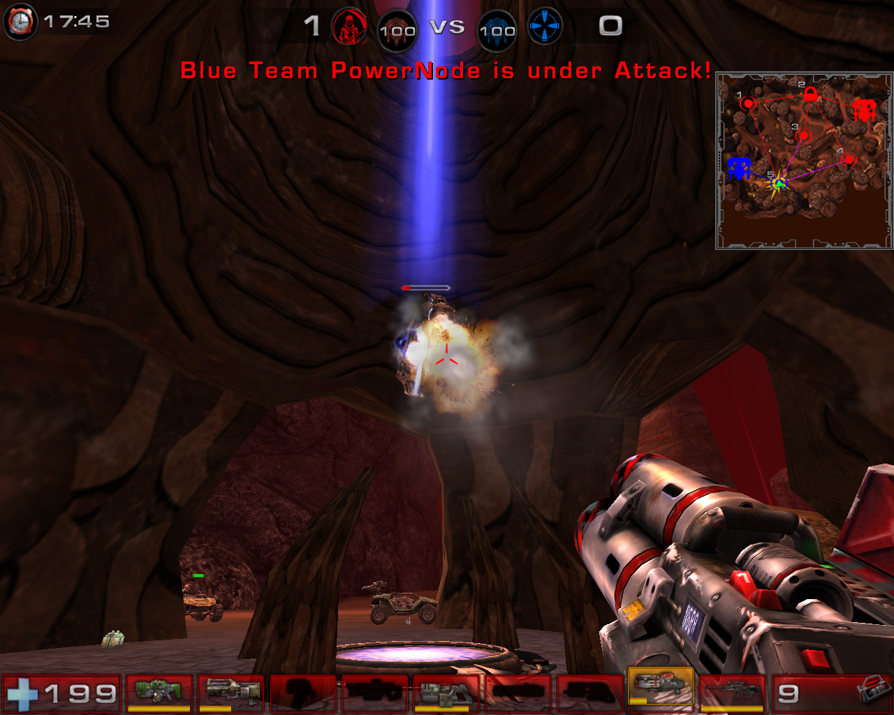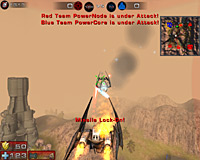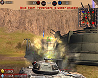 それでは早速,Onslaught[画面1]の解説に入る。本モードは,敵ベース内にあるパワーコアを破壊したほうが勝ちというチーム戦のモードだ。ただしいつでもコアを破壊できるというわけではなく,両ベース間にあるパワーノードと呼ばれる施設を,自軍コアに隣接しているものからリンクしている順に占領していく必要がある。最終的に敵コアに隣接するノードまで自軍のリンクを張ると[画面2],敵コアを攻撃できるのである。