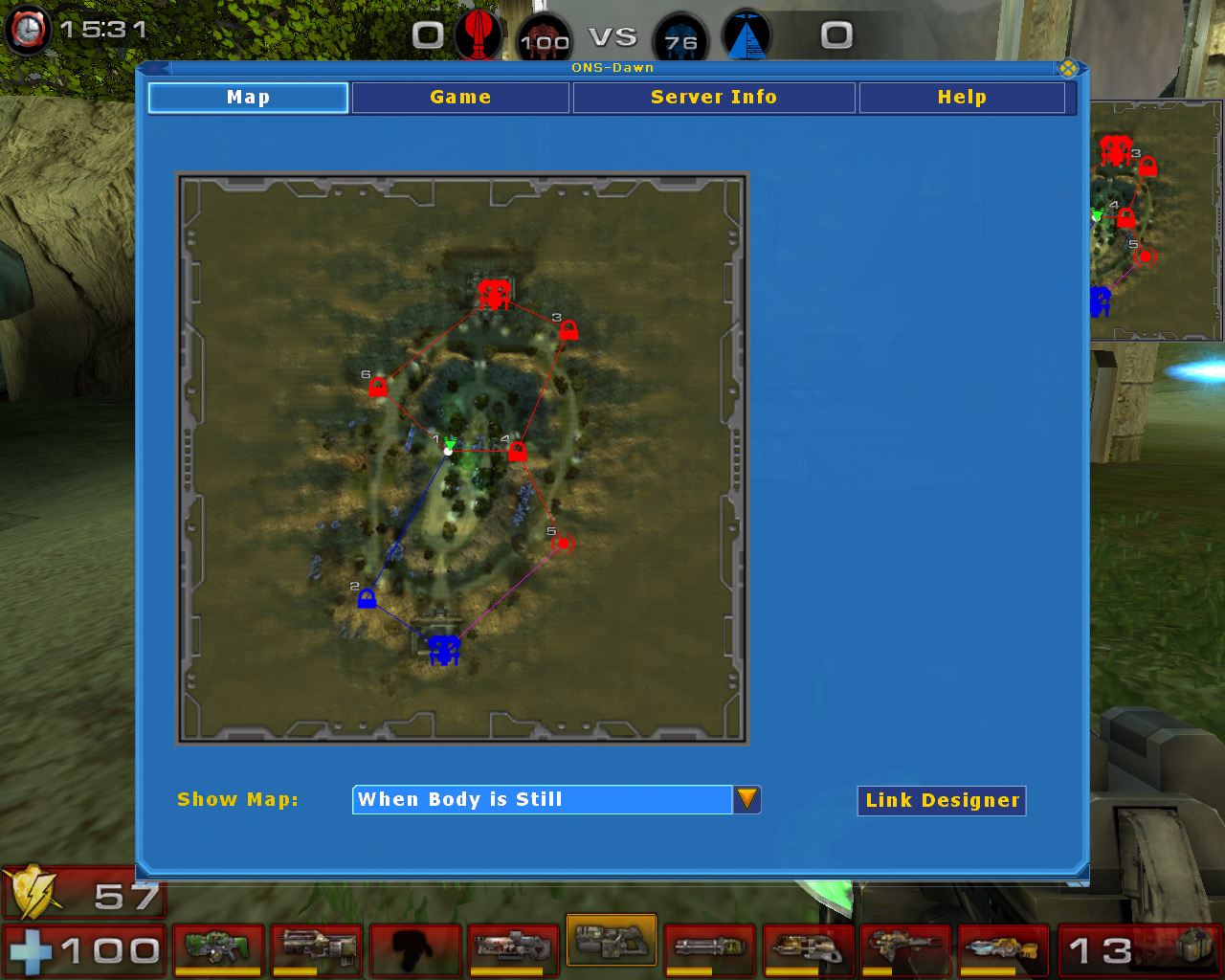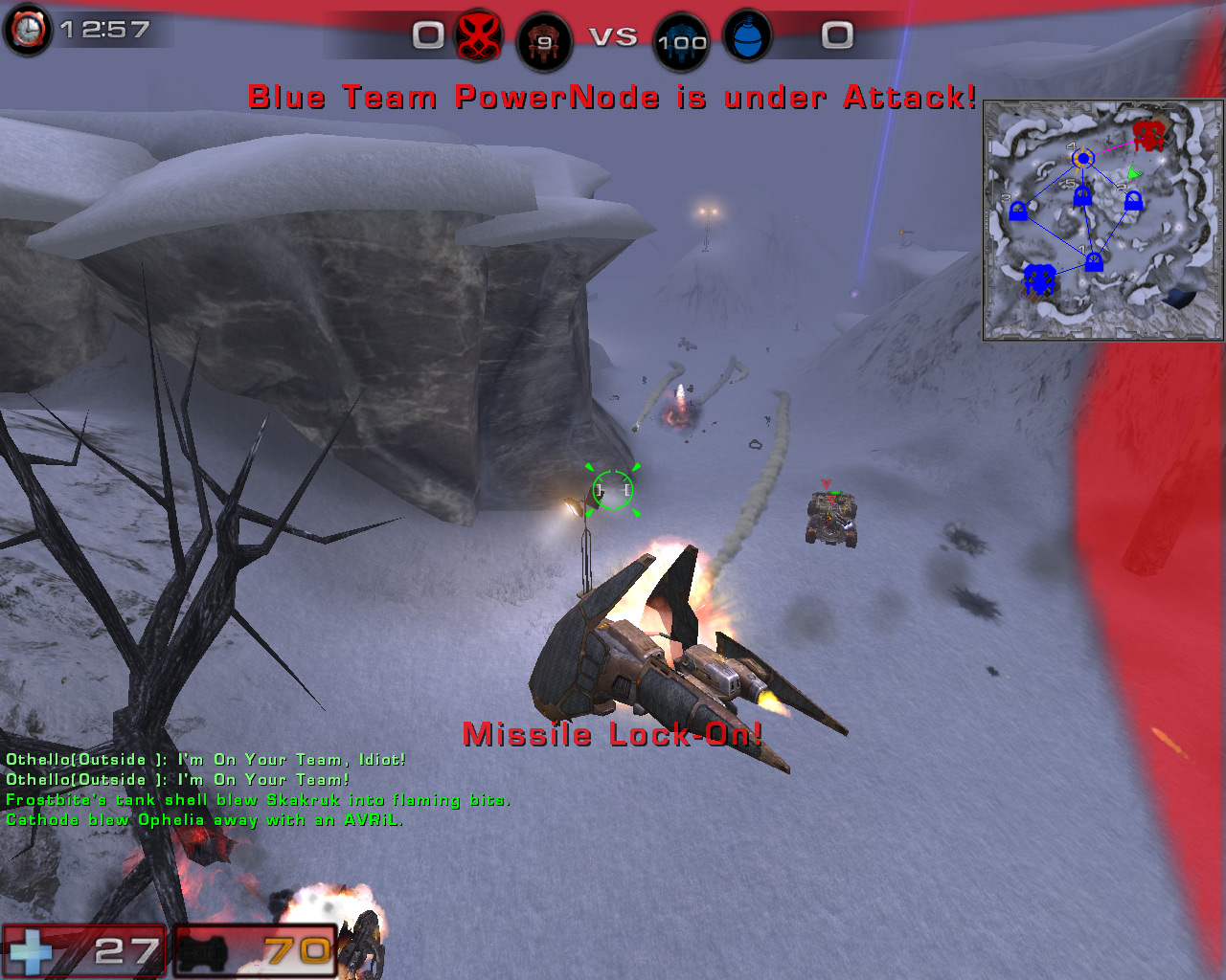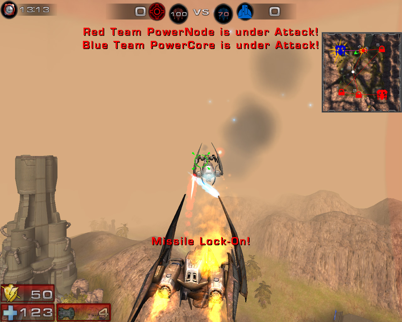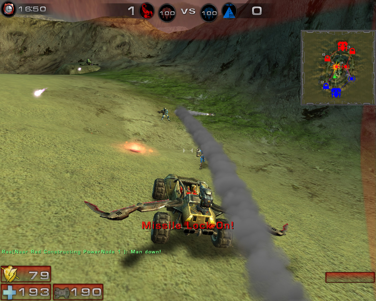 それでは早速,Onslaught[画面1]の解説に入る。本モードは,敵ベース内にあるパワーコアを破壊したほうが勝ちというチーム戦のモードだ。ただしいつでもコアを破壊できるというわけではなく,両ベース間にあるパワーノードと呼ばれる施設を,自軍コアに隣接しているものからリンクしている順に占領していく必要がある。最終的に敵コアに隣接するノードまで自軍のリンクを張ると[画面2],敵コアを攻撃できるのである。
