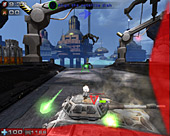 マップは中サイズのものが多く,8〜16人用の"Slaughterhouse"[画面32]や6〜14人用の"Colossus"[画面33]は広めで多人数で楽しめる。お勧めは,8人用の"Skyline"[画面34]。確実にkm単位の高さがある,猛烈に高いビル3棟の屋上近辺(建設途上)を舞台にしたマップなのだ。縮み上がること間違いなしの"かすむ地表"を見下ろしつつ,屋上間をジャンプで行ったり来たりして戦うので,スリル満点である。