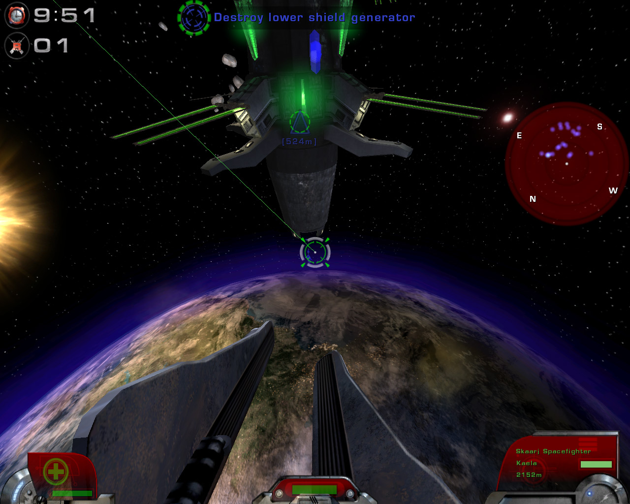 全マップ中,唯一の宇宙戦を体験できるMotherShip。正面の人工物が,乗り込むべき敵基地だ。下にあるのは地球 |