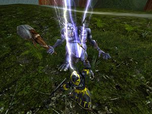 次に,経験値の入り方の質問。一撃ごとなのか,それともEQのような総ダメージ量で決まるのか……。これは,EQのようなシステムになるとのこと。モンスターに対してダメージを一番多く与えたプレイヤー(が,入っているパーティ)が,経験値を得るというものだ。