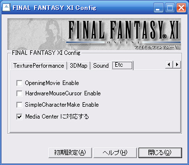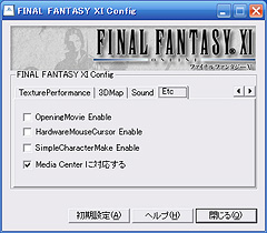 これはFFXIの例。「FINAL FANTASY XI Config」から,「Etc」タブを開くと,メディアセンターに対応するためのチェックボックスが用意されている。これにチェックを入れれば準備完了だ。FMOの場合は,「FrontMissionOnlineConfig」から,メディアセンターに対応するためのチェックボックスを利用できる |