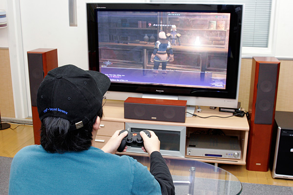 FFXIをプレイしているところ。とにかくキャラクターが大きいのは,写真からも分かってもらえると思う。また,画面が大きいと,プレイヤーの視界ほぼすべてがゲーム画面になるため,ゲーム世界への没入度もぐっと増す