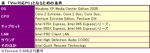 でも,自分が買ったPCにリモコンなんて付属していないし,オプションとして販売されていた記憶もない,という人は少なくないと思うが,それには理由がある。先ほど説明したIntel Quick Resume TechnologyなどといったViivの独自機能を利用するには,高度なソフトウェアチューン技能が必要とされ,その情報はPCメーカーのみに提供されているのだ。同時に,Viiv対応PCとなるには,以下の表に示した条件をクリアする必要がある。