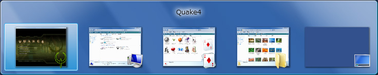 Aeroの効果が最も分かりやすいのはタスクを切り替えるときだ。Aeroから[Windows]+[Tab]キーを押すと利用できる「Flip3D」。「Quake 4」などのゲームも含め,すべてのウィンドウを3D表示で切り替えられる。実用性はともかく,見た目は派手だ(※拡大画像は1920×1200ドットなので,開くときは気をつけてください) |