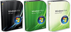 Windows Vistaの製品ボックス。左から順にUltimate,Home Premium,Home Basicのものだ