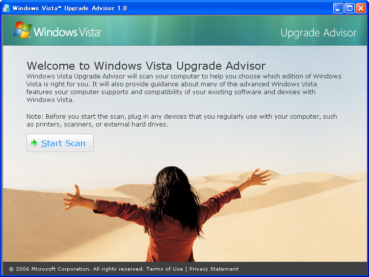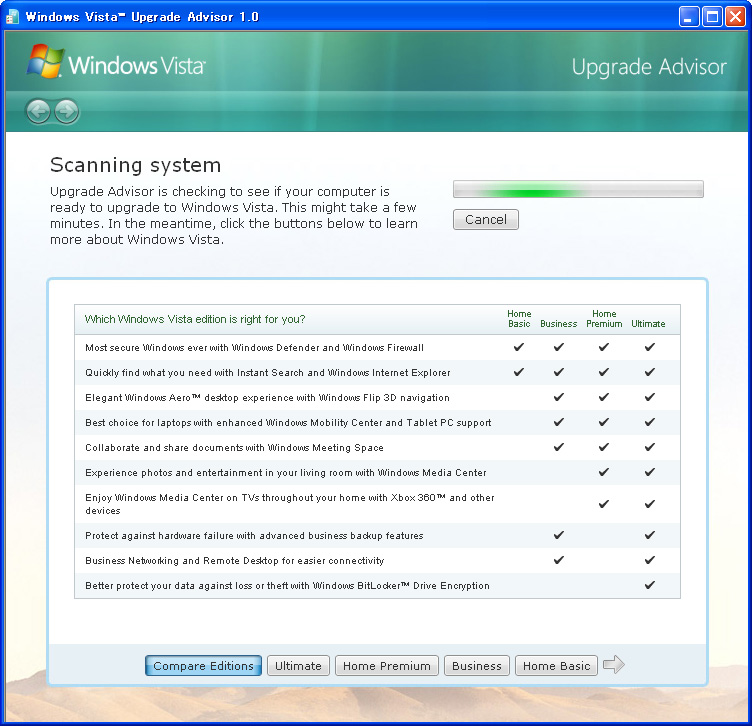 Windows Vista Upgrade Advisorは,MicrosoftのWindows Vista紹介ページから入手できる英語版ソフトウェア(日本語版は2007年1月公開予定)で,Windows XP上から実行可能だ。インストールは,ウィザードに従うだけの簡単仕様。実行すると,アップグレード対象となるエディションに手持ちのPCはそのまま移行できるのか,そうでない場合,何をすればいいのかを教えてくれる。