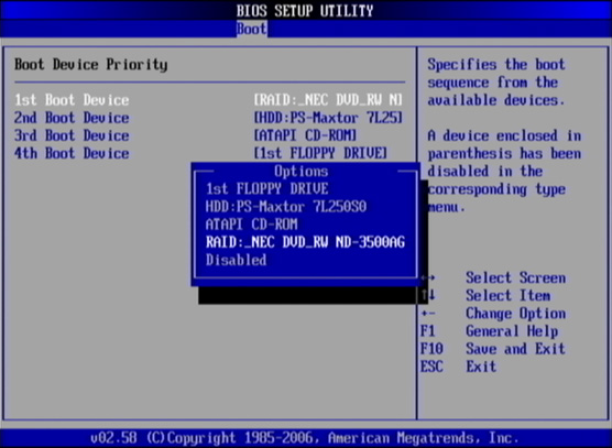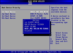 (1)Windows XPと同様,Windows Vistaのメディアを光学ドライブに挿入し,同ドライブからPCを起動する。画面はP5B Deluxeのものだが,大小メーカー製PCでも,たいていは「Boot」など,ブート(=起動)に関連したBIOSメニューから変更できる |