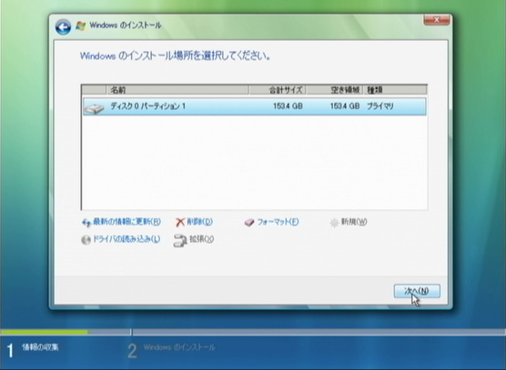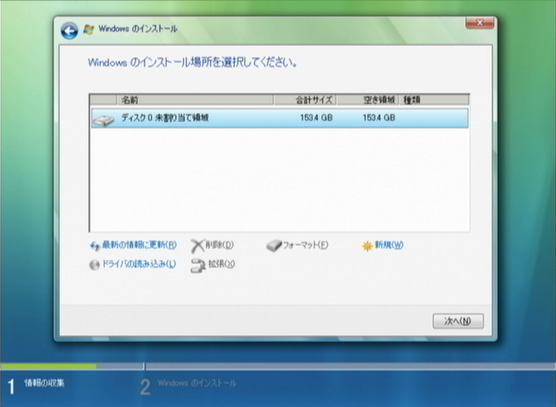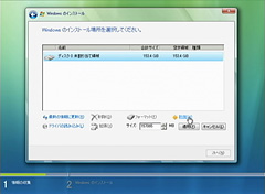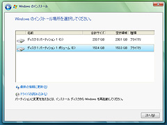 (7)Windows VistaをインストールできるHDD一覧が表示される。画面は,まっさらな状態のHDDが1台だけ接続されている例になるが,本文で触れたように,Dドライブへインストールするような場合は,ここに2台以上並ぶことになる |