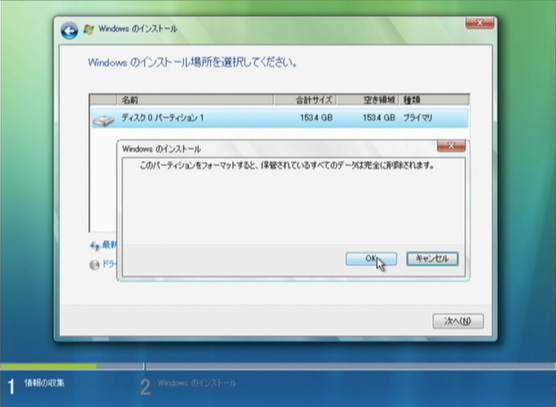 (9)すると,指定したサイズをWindows Vista用にフォーマットすることの了解を求めるウィンドウがポップアップする。ここは迷わず[OK]を押してかまわない |