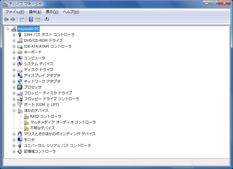 (14)(13)の状態でデバイスマネージャを確認すると,今回の構成ではマザーボード上のJMicron製RAIDコントローラ,そして「Sound Blaster X-Fi Fatal1ty」が標準では認識されていないのが分かる。一方,GeForce 7900 GSは標準でMicrosoft製ドライバがインストールされている |
