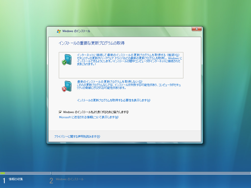 (2)「インストールの重要な更新プログラムの取得」に移る。PCがインターネットに接続されているなら,「インターネットに接続して最新のインストールの更新プログラムを取得する」を選ぶ |