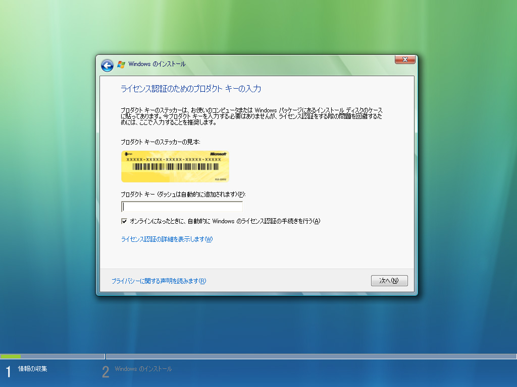 (3)(A)−(4)にもあったプロダクトキーの入力画面が出てくるので,入力して[次へ] |