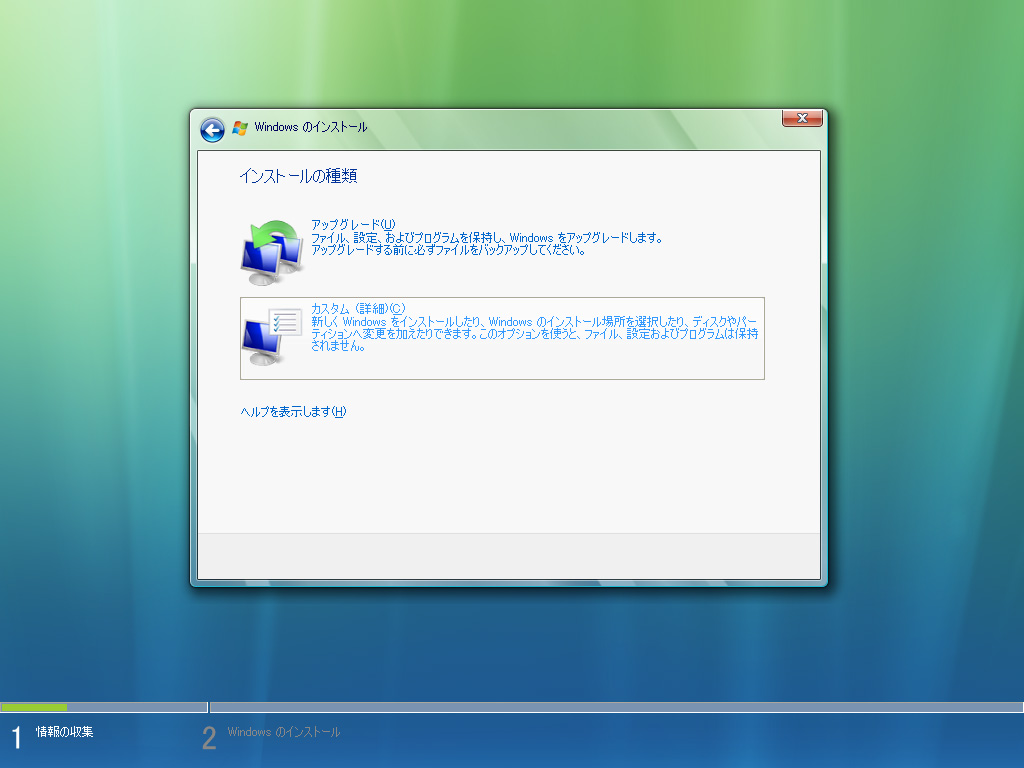 (6)インストール方法の選択ウィンドウに移るので,「カスタム」を選択する(※まっさらなHDDを利用する場合,「カスタム」しか選択できないが,問題ない) |