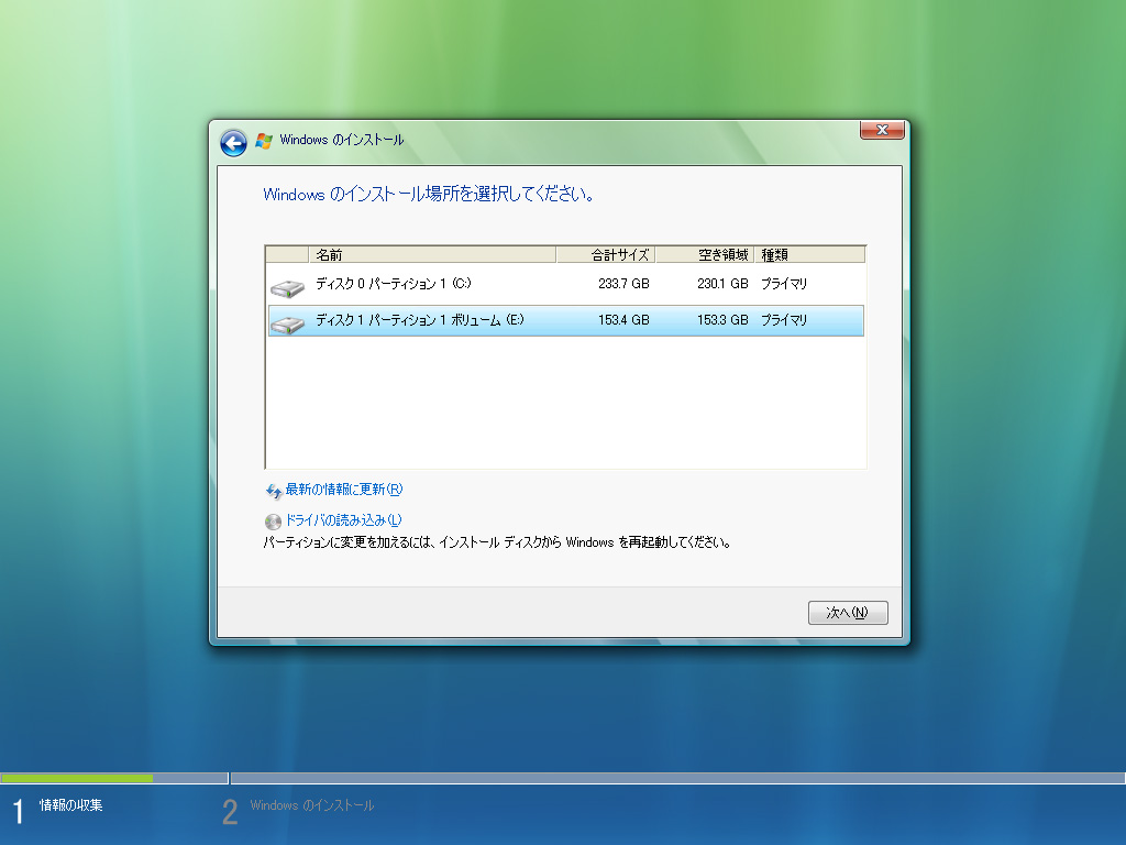 (10)しばらく待つと,(8)で確保した領域が「未割り当て領域」から「パーティション」に変わる。それを確認したら,当該パーティションを選択して,[次へ]を押す |