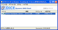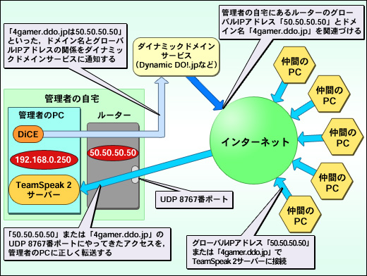 何度か使ってみるだけならそれでもいいが,今後,長期的にTeamSpeak 2を利用するなら,「ダイナミックドメインサービス」を利用するといいだろう。これは一言でいうと「グローバルIPアドレスを『4gamer.net』のようなドメイン名に関連づける」もの。これを利用すると,ユーザーはグローバルIPアドレスでなく,(ある程度)分かりやすい,ドメイン名を使ってTeamSpeak 2サーバーへ接続できるようになる。