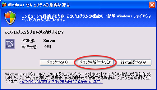 さて,いよいよTeamSpeak 2サーバーソフトを起動しよう。初回起動時にはWindowsファイアウォールから警告を受ける場合があるので,右のようなウィンドウが表示されたら,慌てず騒がず「ブロックを解除する」を選ぶ。プログラムの名前が「Server」と,一見分かりにくいので要注意。また,市販のファイアウォールソフトが同様の警告ウィンドウを表示する場合もあるが,このときは通信を継続的に許可する方向で設定すればいい。
