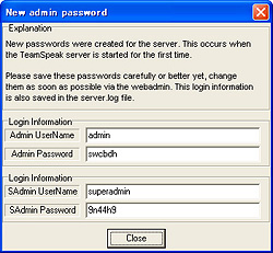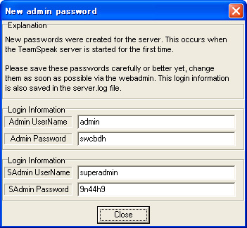 初回起動時には管理者としてログインするための情報が表示される。このパスワードを忘れると,TeamSpeak 2サーバーソフトを再インストールするハメになるので,何らかの手段で控えておこう