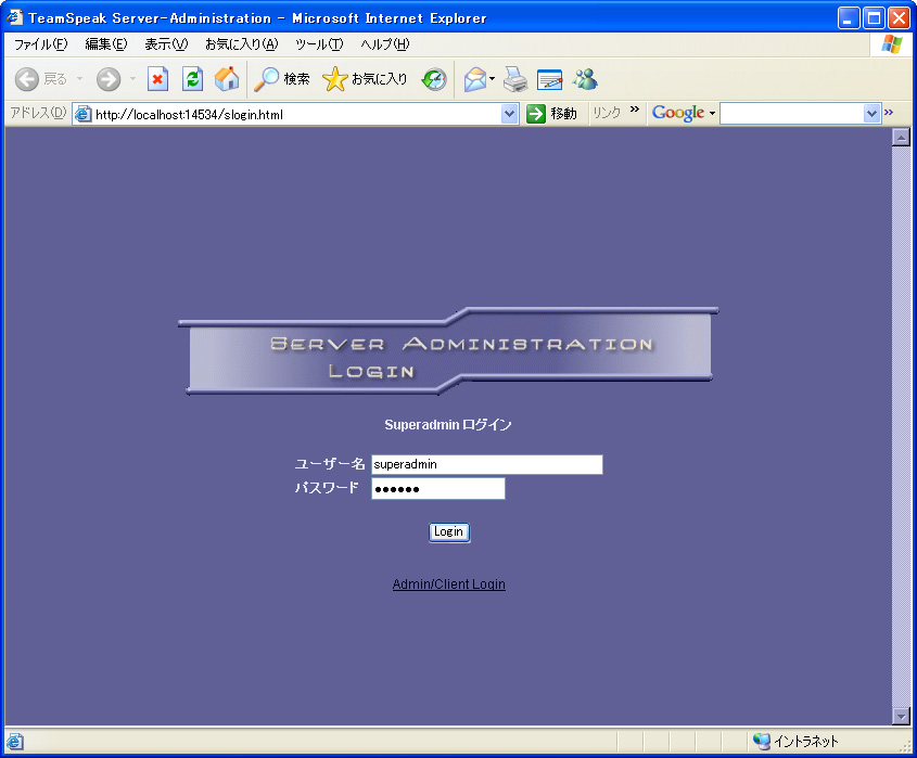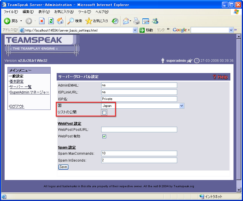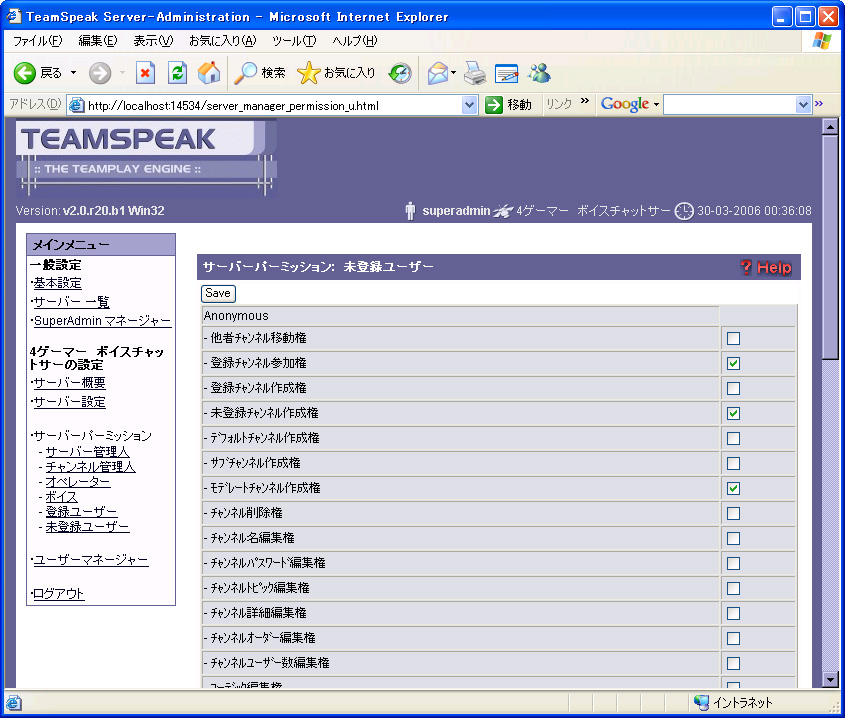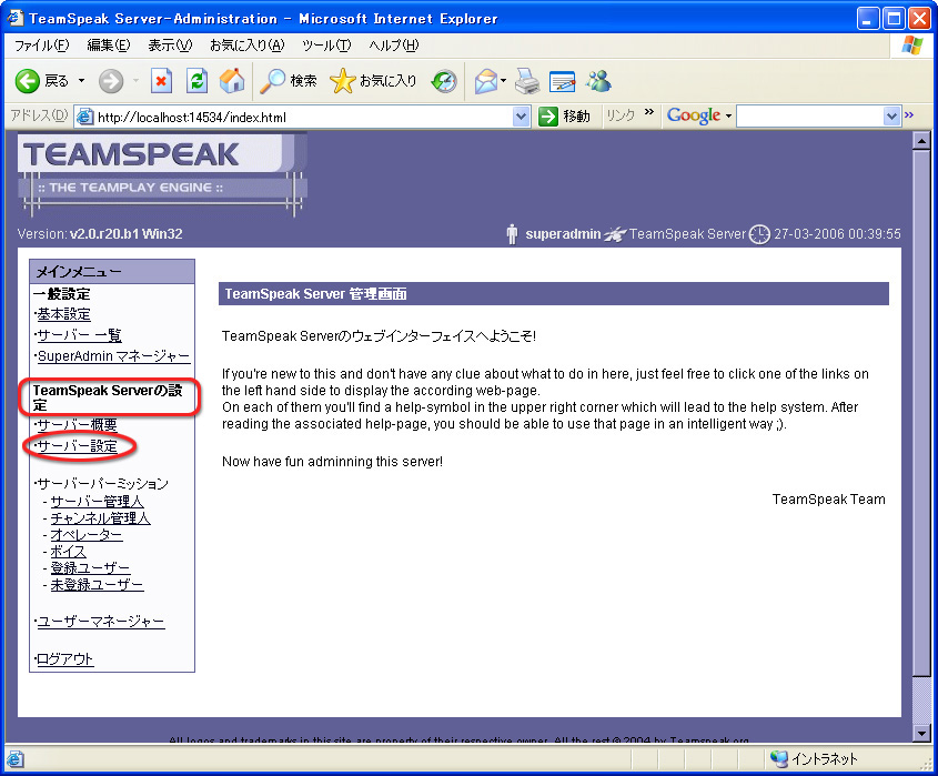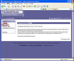 以上で,TeamSpeak 2サーバーソフト自体の設定は終了。SuperAdminとしては,ログアウトしてしまってかまわない。