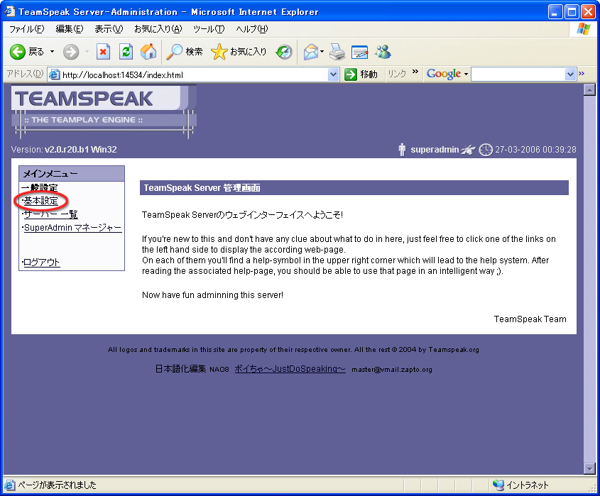 正しく入力されていれば,「TeamSpeak Server管理画面」が表示されるだろう。ここからTeamSpeak 2サーバーソフトの設定を行っていく。まず,左の「メインメニュー」から「基本設定」をクリックしてほしい。