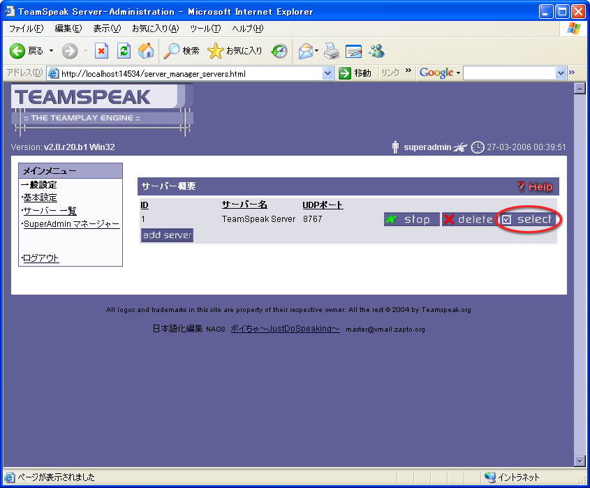 続けて「メインメニュー」から「サーバー一覧」をクリック。「サーバー概要」の1番めに,「TeamSpeak Server」が表示されているはずなので,「Select」ボタンを押す。