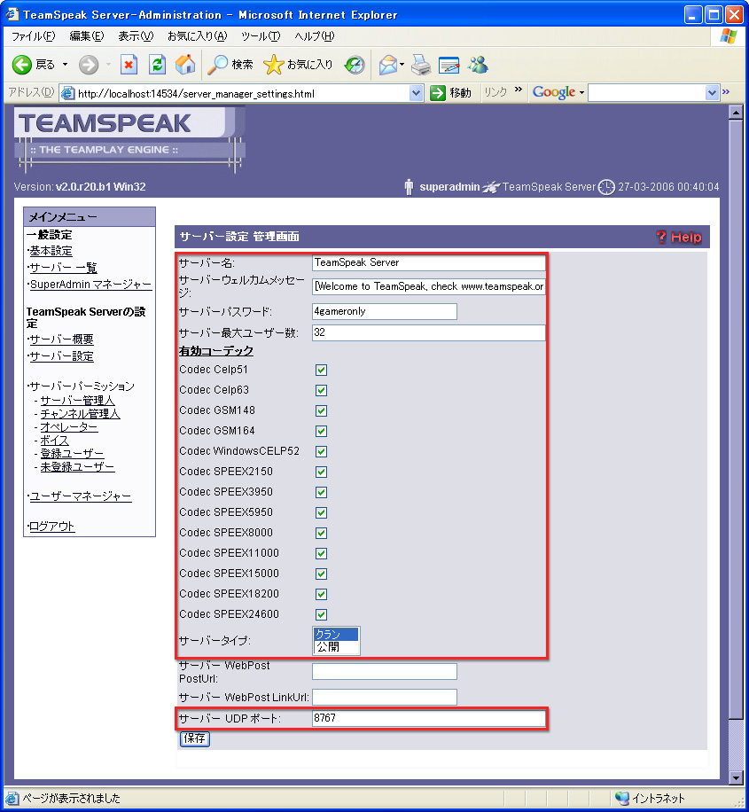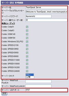 ほかの設定はそのままでいい。「有効コーデック」がすべてチェックされ,「サーバータイプ」が「クラン」,「サーバーUDPポート」は「8767」になっているのを確認したら,「保存」ボタンを押す。