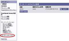 管理者側で,仲間全員分のユーザーアカウントを用意する場合は,メインメニューから「ユーザーマネージャー」を選択。すると,「admin」が表示されている,右のような画面が表示されるが,このadminは,初回起動時に表示された二つのIDのうち,サーバー機能の管理者IDのほう。このように,adminは自動的に登録されている。