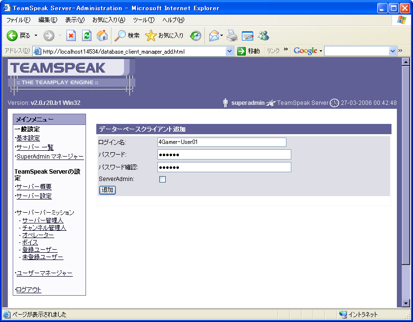 なお,入力項目の中に「ServerAdmin」というボックスがあるのに気づいたと思うが,これはユーザーにサーバー機能の管理者権限を与えるかどうかの選択肢だ。ここにチェックが入っているユーザーは,前述したadminと同じように,サーバー機能の管理者(TeamSpeak 2サーバーソフトの管理者「SuperAdmin」ではない)として,TeamSpeak 2サーバーソフトのいくつかの機能を設定できるようになる。PCに詳しい人や,チームリーダーなどを登録するときは,チェックしておくと便利かもしれない。