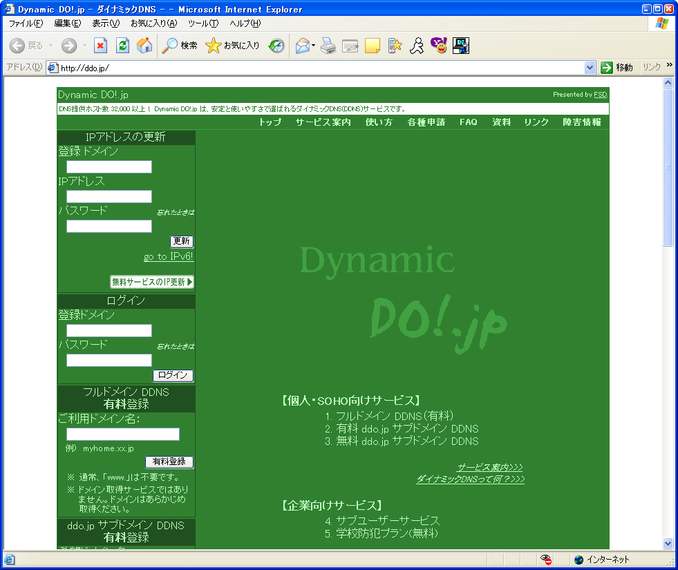 これで「(ユーザーが登録したサブドメイン).ddo.jp」が利用できるようになった。「IPアドレスの更新」から,グローバルIPアドレスとパスワードを入力して,「更新」ボタンを押して,5〜10分待つと,「(ユーザーが登録したサブドメイン).ddo.jp」がグローバルIPアドレスと関連づけられる。