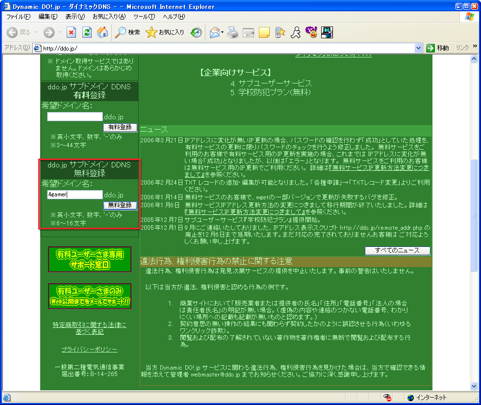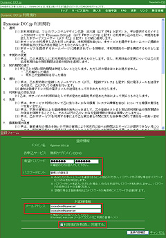 トップページの左下に「ddo.jp サブドメイン DDNS 無料登録」があるので,「希望ドメイン名」に6文字以上の英数字で好きなものを入力し「無料登録」ボタンを押す。早い者勝ちなので,すでに取得されていたら,別の名前を何か考える。ここで登録した内容はDynamic DO!.jpのサブドメイン(メインのドメイン名「ddo.jp」のサブ的なドメイン名,という意)として扱われるが,以後本稿では「ユーザーが登録したサブドメイン」と表記する。