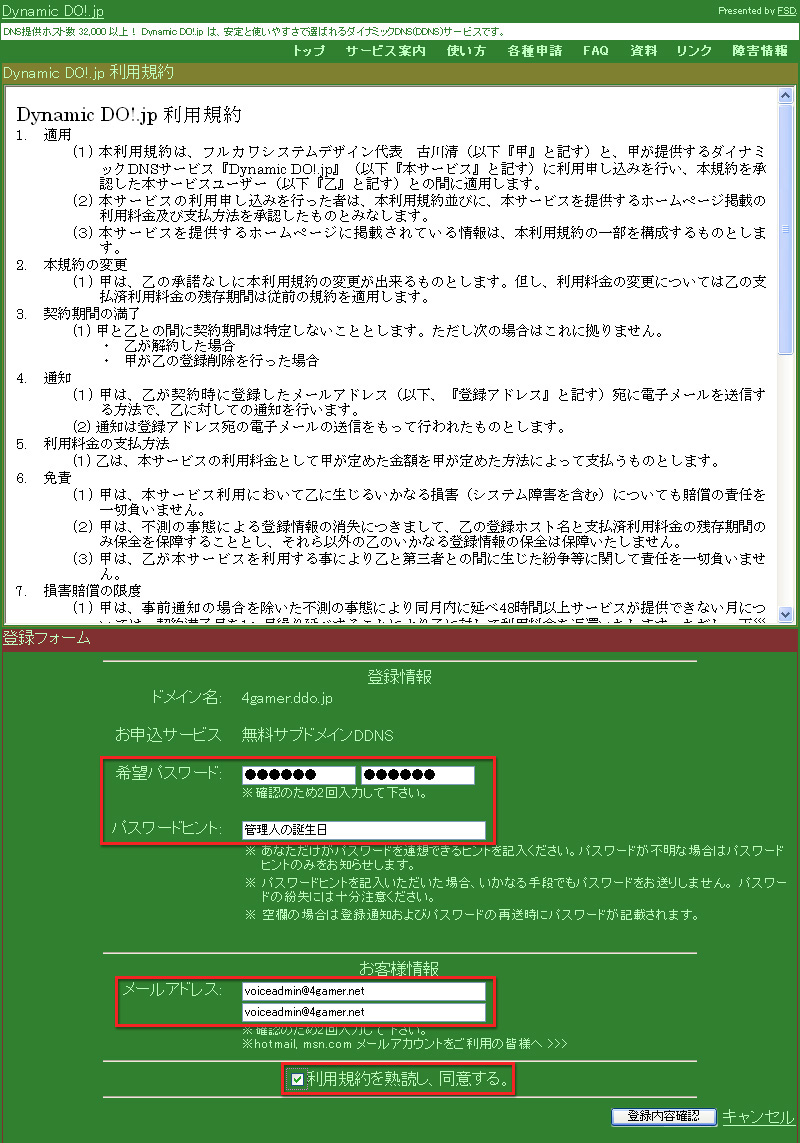 利用規約が表示されるので,よく読んだらページ下の「登録フォーム」に移る。「希望パスワード」と,パスワードを忘れたときの再発行に必要となる「パスワードヒント」,「メールアドレス」を入力しよう。なお,メールアドレスにYahoo!やMSNなどの,いわゆるフリーメールアカウントは利用できないので,普段利用しているメールアドレスを登録する。(※メールアドレスは例示用のダミーです)