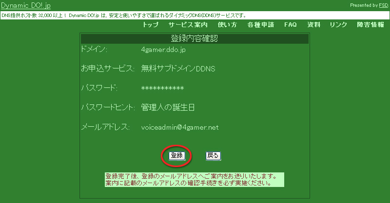 上の画面で「登録内容確認」ボタンを押すと,登録内容の確認ページが表示されるはず。ここで内容をチェックし,問題なければ「登録」ボタンをクリックしよう。