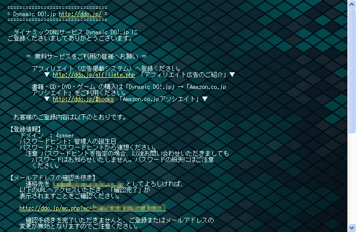 しばらくすると登録確認のメール(画面)が,先ほど登録したメールアドレスに届く。そこには,登録した内容を最終的に有効化する「メールアドレスの確認手続き」が必要と書かれているので,メールの指示に従って,確認ページで,これまた先ほど登録したパスワードを入力する。これで登録作業は完了だ。