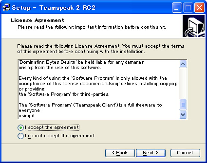 ダウンロードしたファイル(2006年4月9日時点では「ts2_client_rc2_2032.exe」)を実行すればインストールできるので,とりあえずウィザードに従っておけば問題ない。「Licence Agreement」(利用許諾)の画面で,「I accept the agreement」のラジオボタンを選ぶ必要があるのと,人によっては「Select Destination Directory」(インストール先)を変更する必要があるかもしれない程度で,基本的には「Next」を押していけばいい。