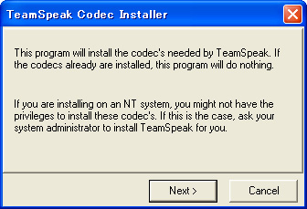 インストーラも当然英語だが,基本的には「Next」をクリックするだけで大丈夫。途中で「TeamSpeak Codec Installer」がポップアップするが,ここも慌てず騒がず「Next」を押して継続しよう。最後に「Launch Teamspeak」のチェックを外しておくのはお忘れなく。もっとも,起動してしまったら,終了すればいいだけの話だが