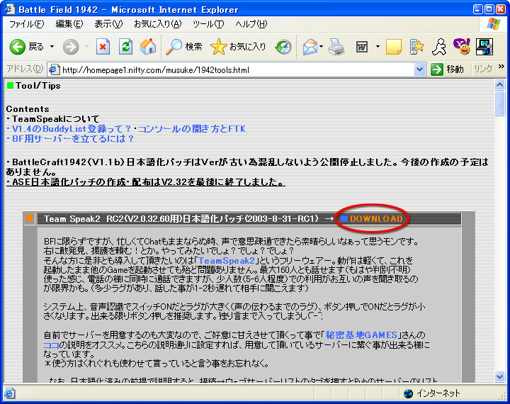 次に日本語パッチをダウンロードしてインストールする。日本語パッチは「Mu-suke」氏のWebサイトで,「Banz/BF1942」→「Tool/Tips」の順にページを移動するとダウンロード可能だ。ダウンロードしたファイルはzip形式の圧縮ファイルになっていから,Windows XPならダブルクリックすれば必要なファイルにアクセスできる。