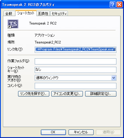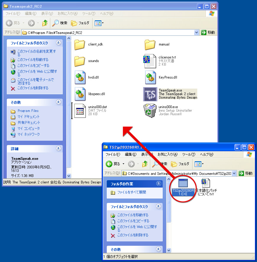 ダウンロードしたzipファイルの中に入っている日本語パッチファイル「TS2jp203260RC1.EXE」を,TeamSpeak 2クライアントソフトのインストールされたフォルダにコピーする。場所は通常「C:\Program Files\Teamspeak2_RC2」だが,デスクトップにある「TeamSpeak 2 RC2」のショートカットを右クリックして,コンテキストメニューからプロパティを開き,「リンク先を探す」ボタンを押すことでもフォルダは開ける。