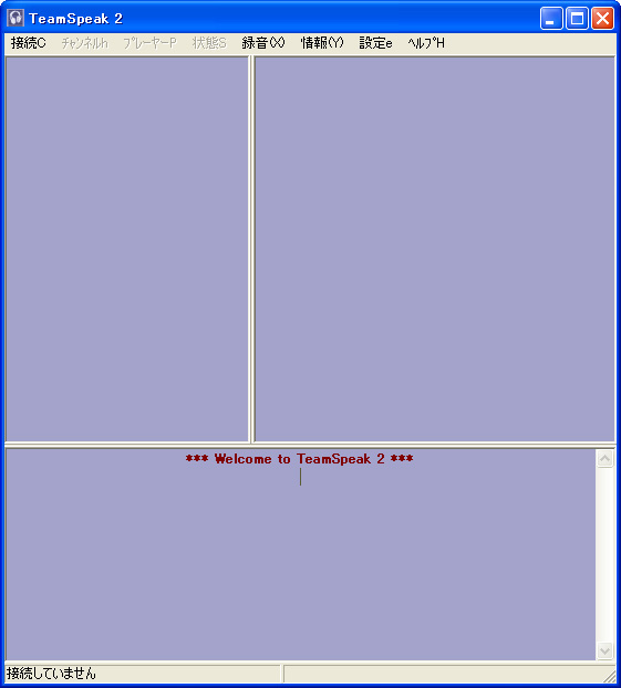 ウィンドウは三つに分割されているが,左上には接続したTeamSpeak 2サーバーにいる,ほかのユーザーの情報が表示されることになる。同様に,右上は接続したTeamSpeak 2サーバーの情報,下にはそのサーバーからのメッセージなどが表示される。