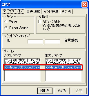 メニューバーから「設定」→「オプション」をクリック。設定ウィンドウが開くので,「サウンドデバイス」タブで,「入力デバイス」「出力デバイス」がそれぞれ,ヘッドセットを接続したサウンドデバイスになっていることを確認する。基本的には「プライマリ〜」と書かれているものが選ばれていればOKだが,第2回で説明したような形で,USBサウンドデバイスなど,「ヘッドセット専用の,2系統めのサウンドデバイス」を用意している場合は,忘れずに指定しておこう。