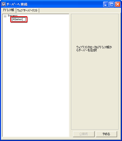 サーバー接続設定は左→右のような手順で行う。どちらかというと,サーバー接続設定というよりは,「接続するサーバーの追加」といったイメージだ。なお,今回はサーバー名を「4Gamer」にしているが,もちろんここは分かりやすいものなら何でもいい