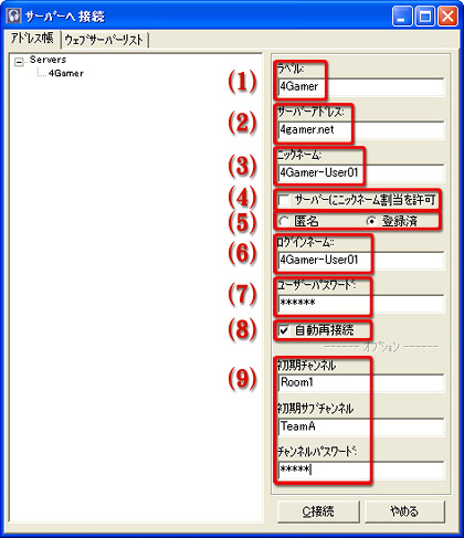 接続サーバーの(インターネット上の)アドレス。「4gamer.net」のような「ドメイン名」の場合や,「123.123.123.123」といったような数字の組み合わせ(「グローバルIPアドレス」)の場合もある。ここは,TeamSpeak 2サーバー管理者から情報をもらってから入力する項目だ。詳しくは後述する。