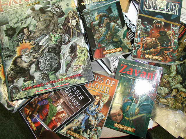 Warhammer Fantasy RolePlay (通称WFRP)は,25年の歴史の間に6版までルールブックが改訂され,ガイドブックや小説など幅広く展開している |