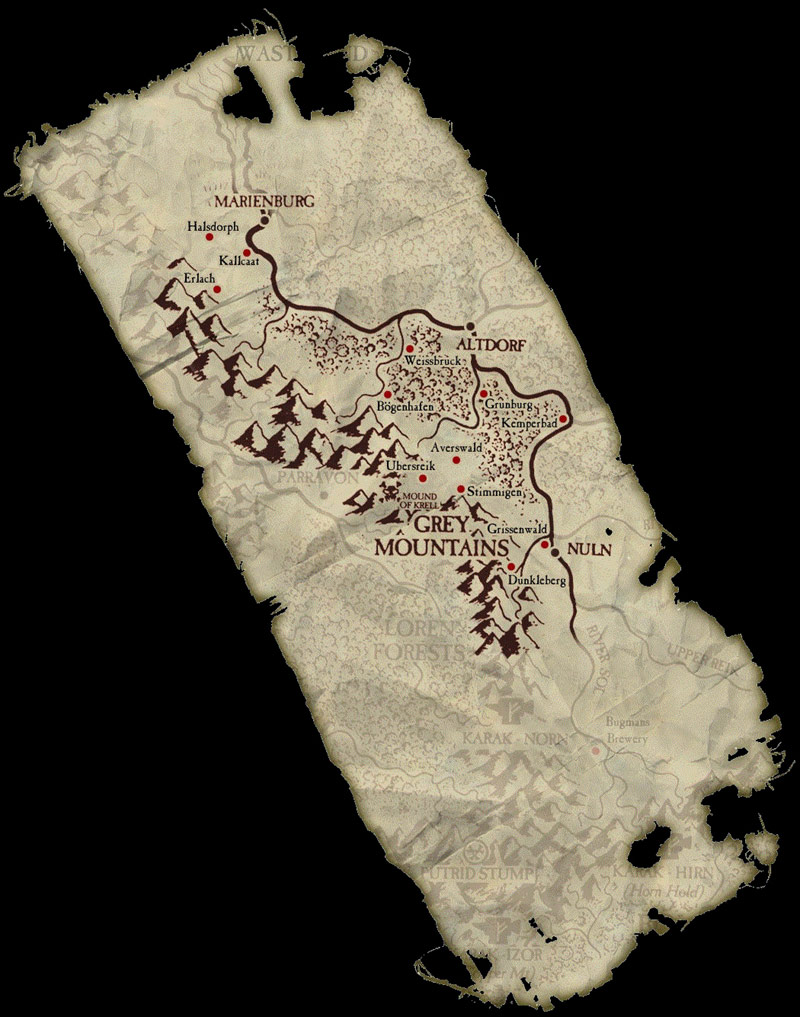 Mountain)に囲まれたレイクランド(Reikland)一帯となります。大きな街は三つありまして,ゲームでどれだけ再現できるか分かりませんが,小さな村になると数10もあります。