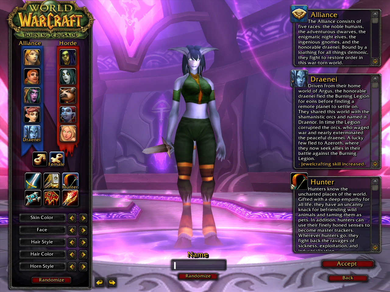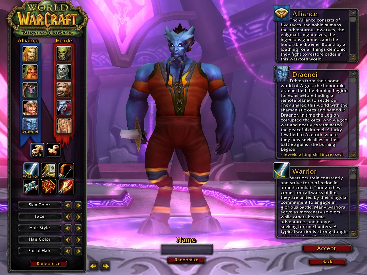TBCで追加されたプレイアブル種族Blood ElfとDraenei。Blood ElfはHorde陣営,DraeneiはAlliance陣営の種族だ |