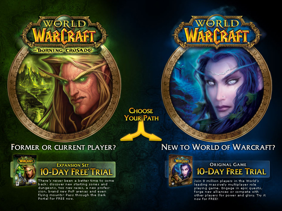 2007年8月11日現在,公式サイトではWoW本体の10日間無料体験のほか,拡張パック第一弾「The Burning Crusade」のトライアルも申し込める。拡張パックのトライアルはすでに正規のアカウントを持っている人が対象なので,初めてWoWで遊ぶ人は右側の青いほうを申し込もう