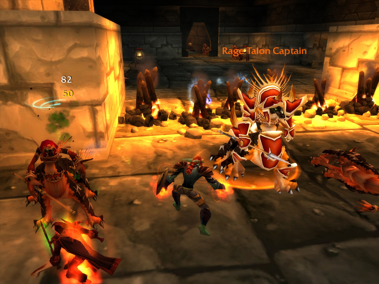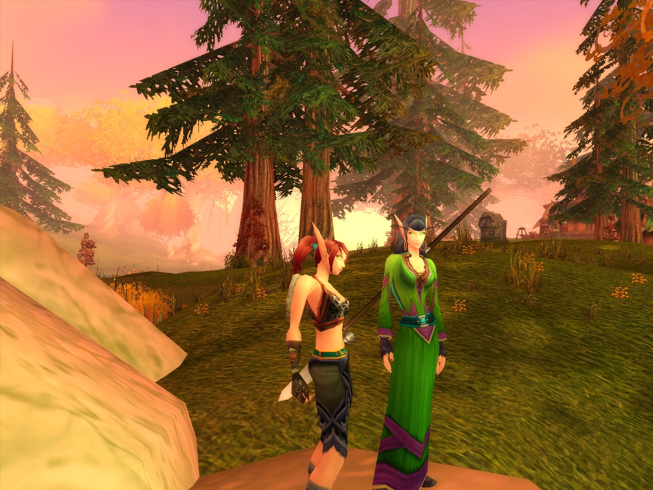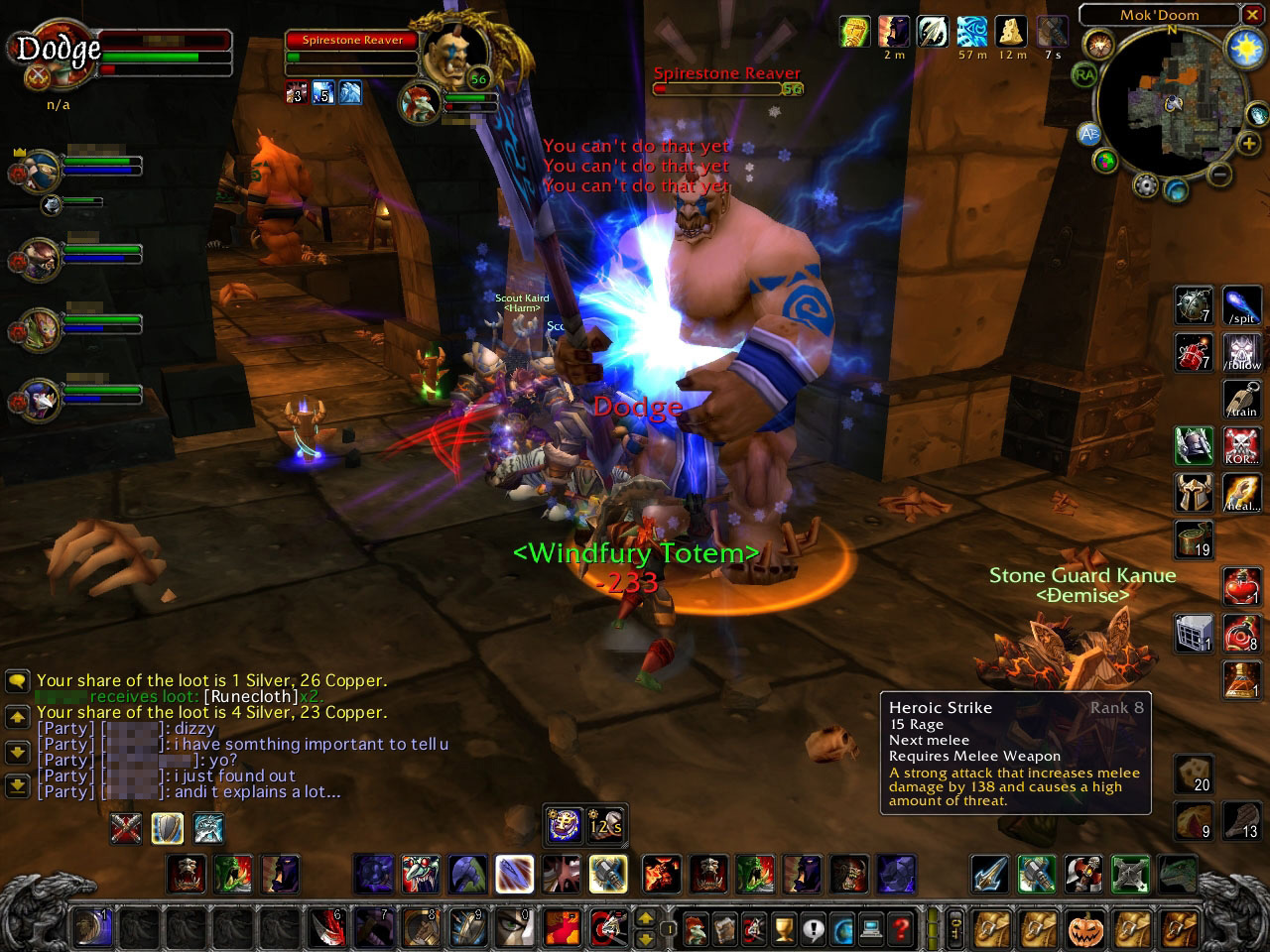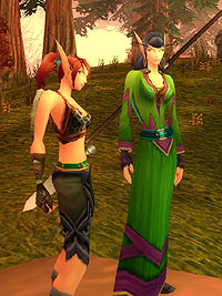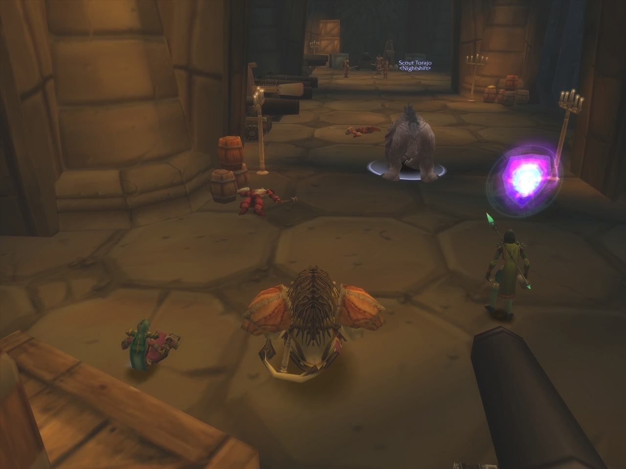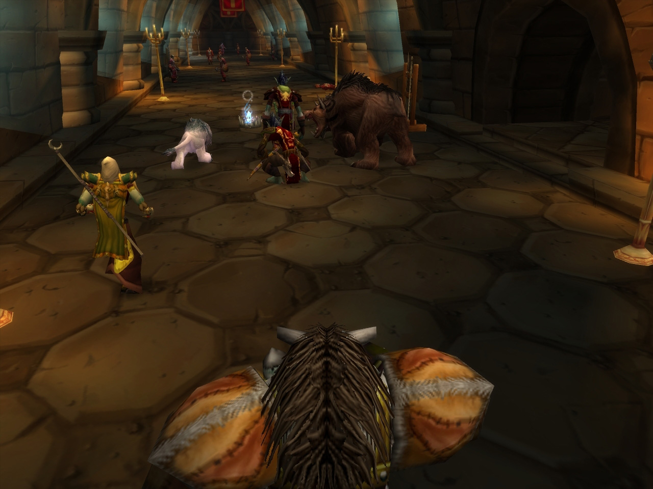 奥に3体のヒューマノイド系Mobがいる。このグループにはMageが2人いたので,タイミングを合わせて2体の敵を同時にヒツジにした。Mageに向かって走ってくる残りの1体をBear FormでタンクしているDruidがキャッチ。危なげない展開だ |
