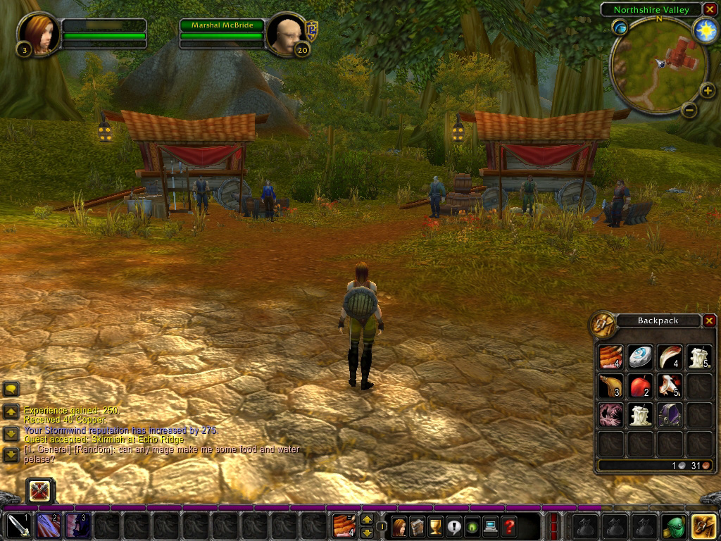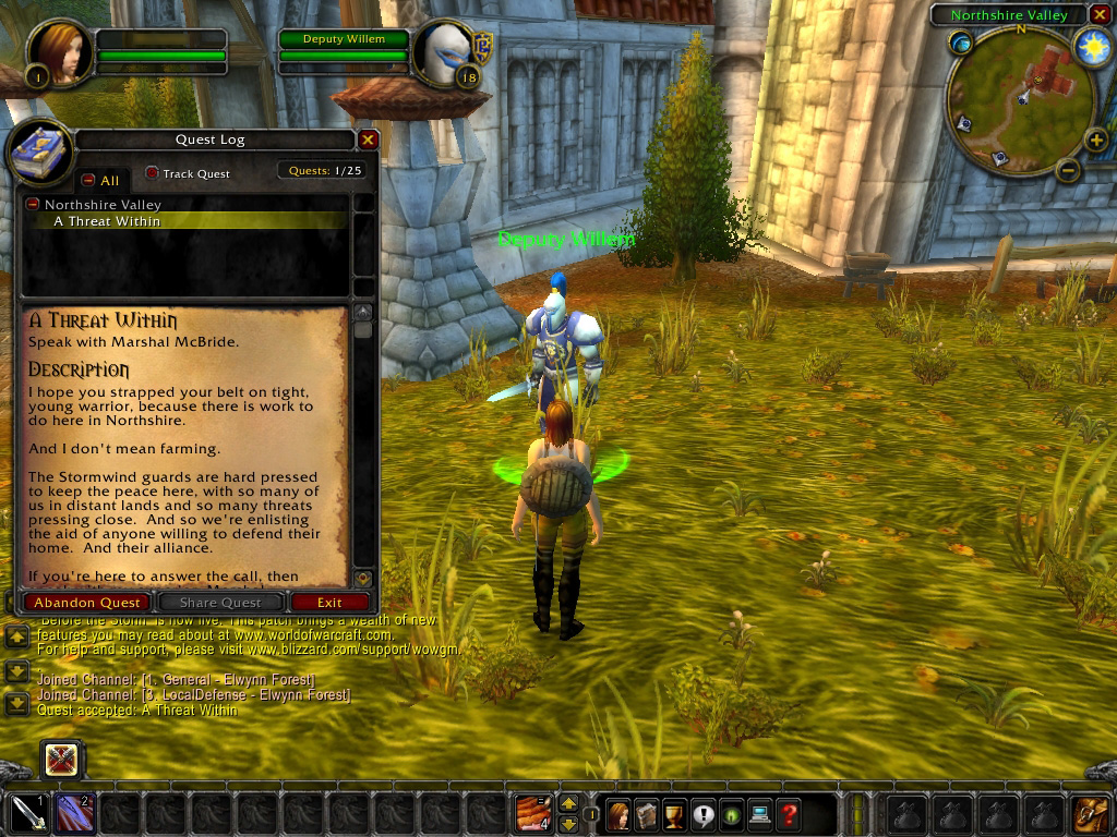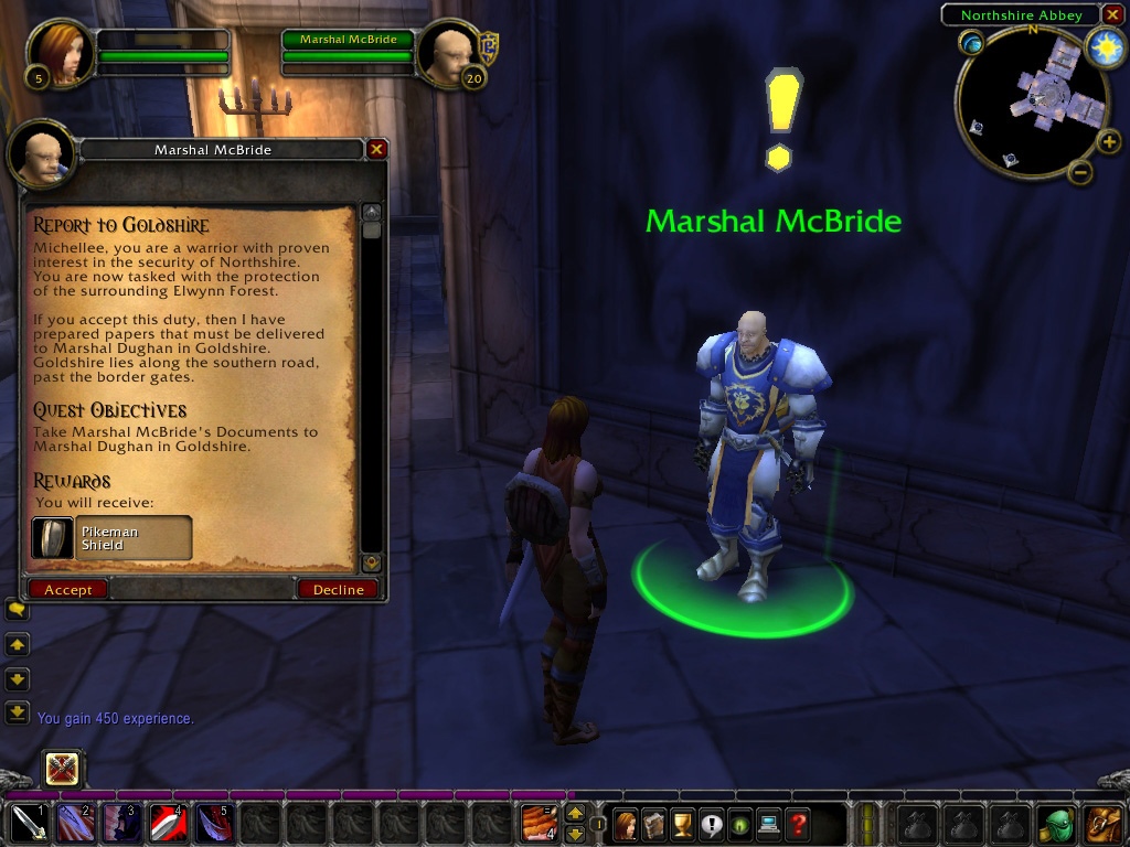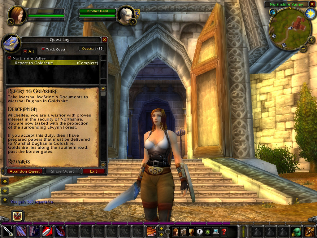 司令官のところまで報告に戻り,報酬を受け取ると,次のクエスト「Report to Goldshire」を渡された。ここから南へ行ったところにあるGoldshireという村まで書類を届けろという内容だ。いよいよ,この初心者用ゾーンを出るときが来たのだ。