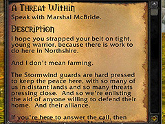 司令官は修道院に入ってすぐの場所にいる。頭上に黄色い「?」を浮かべているので,すぐに分かるだろう。「?」は,このNPCに報告可能なクエストを今,自分が持っているということだ。司令官に話しかけると,その場で「A Threat Within」のクエストは完了となり,すぐに次のクエスト「Kobold Camp Cleanup」を渡される。ここから北に行ったところにいるKobold Verminを10体倒してこいとのことなので,さっそく取り掛かろう。