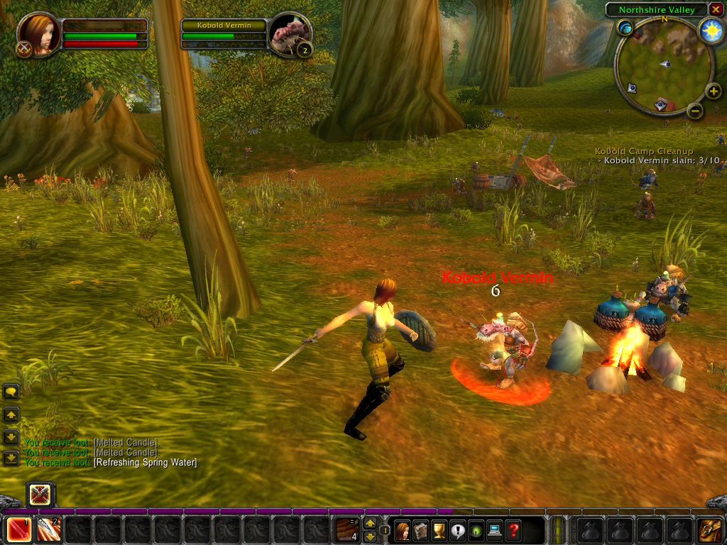 Kobold Verminのキャンプは,修道院の北側の遠くないところにある。手に持った武器でモンスターを攻撃するには,対象に十分に近づいて右クリック,もしくは対象をターゲットしてフルキーの1を押す。フルキーの1はAction Barの1番スロットに該当し,そこにはデフォルトの状態で「Attack」のスキルアイコンが収まっているので,1を押しただけで攻撃状態になるというわけである。